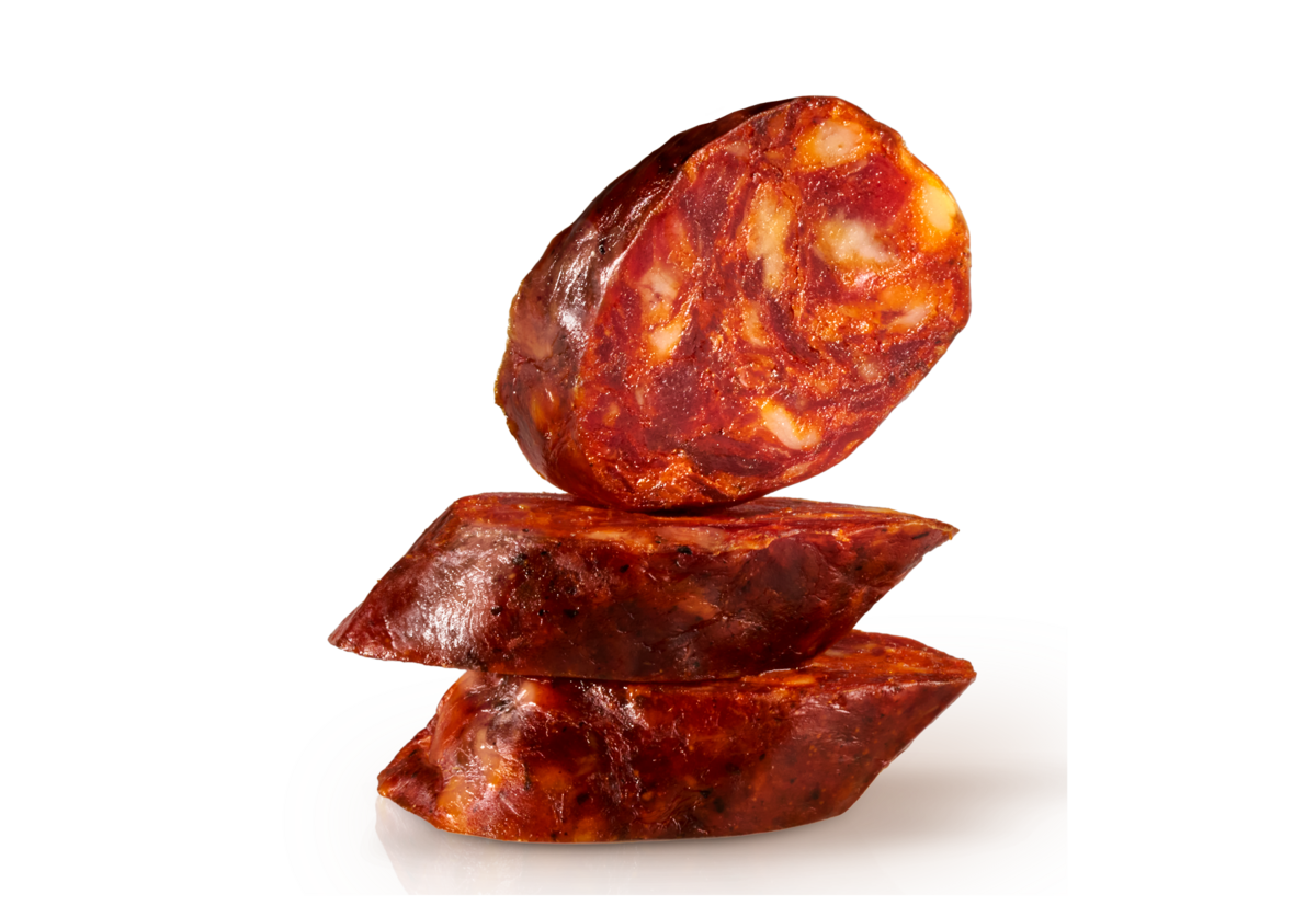Elaborado con carne de cerdo de raza Duroc. Esta raza es conocida por su alta infiltración de grasa, que le confiere ese veteado a la carne, aportando una mayor jugosidad y una textura más tierna al producto final.